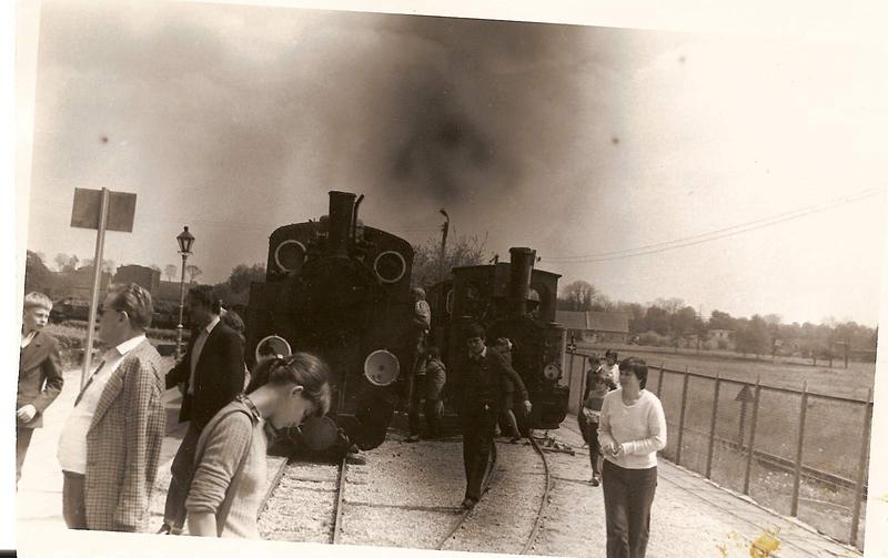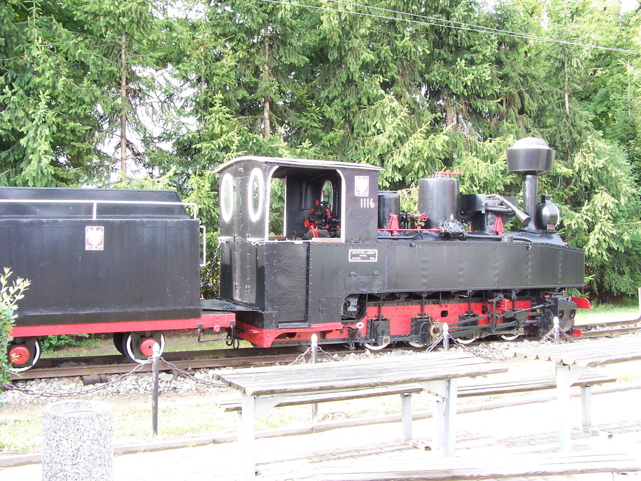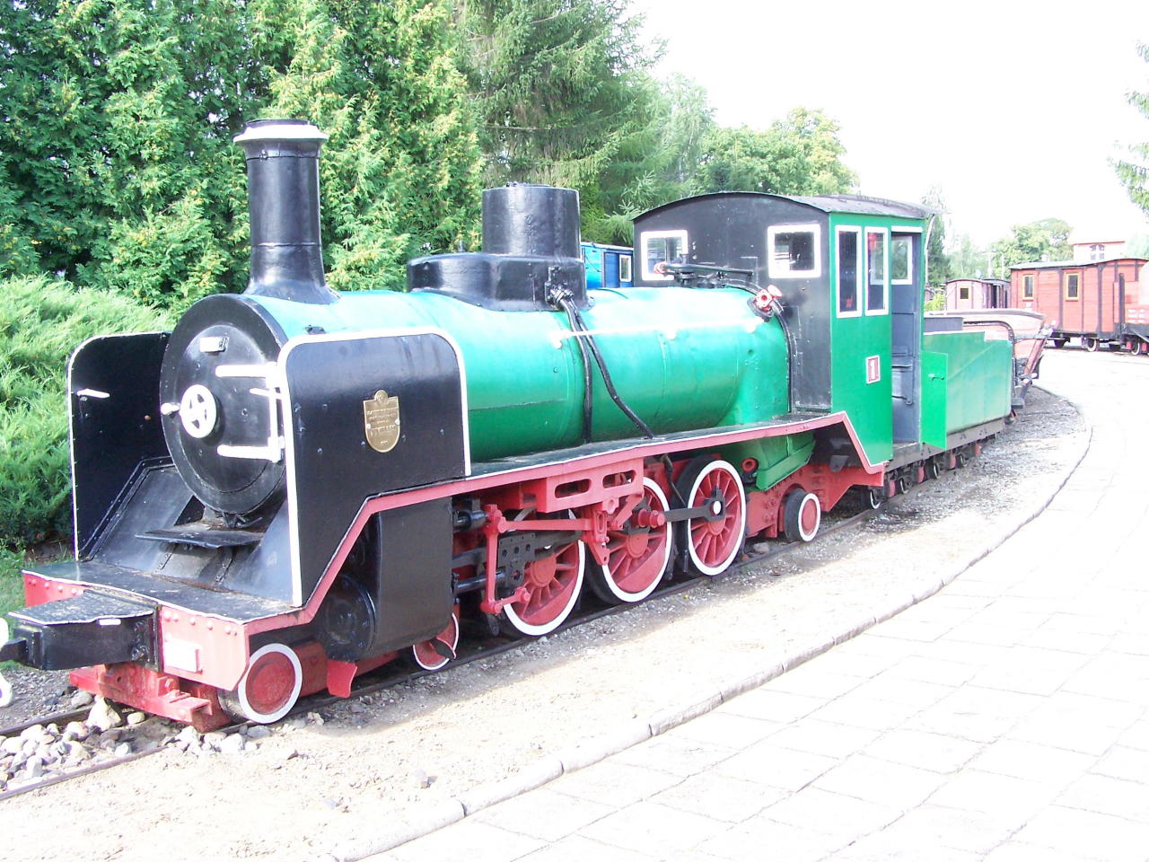 "Parowóz Tx-26 i skład kolejowy kolejki wąskotorowej na stacji. Z lewej przy latarni stoi przewodnik muzeum, Leon Lichociński".
