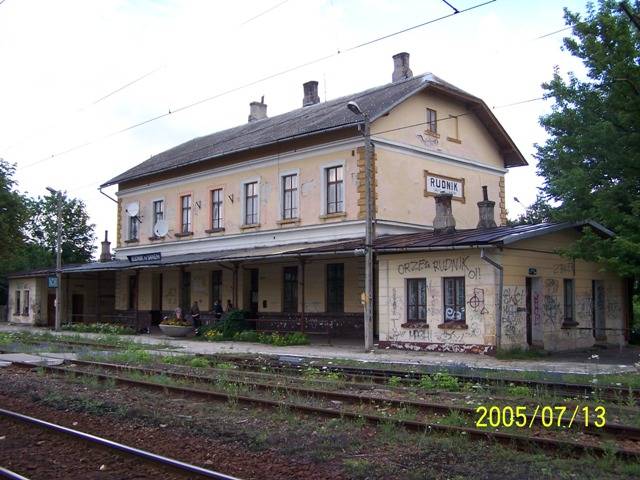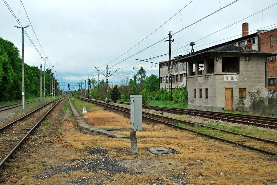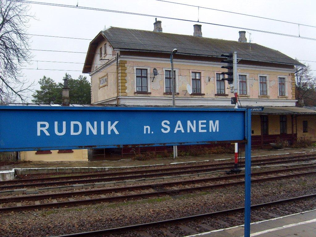 Widok na perony zmodernizowanej w latach 90'tych stacji w Rudniku nad Sanem. W centralnej części zdjęcia widoczne resztki wieży ciśnień. Widok od strony Stalowej Woli.