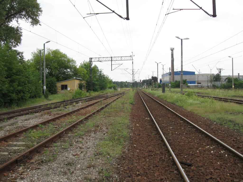 Początek zlikwidowanej bocznicy do zakładów drzewnych Jarot. Z prawej peron. W tle przejazd kolejowy przez ul. Xięcia Adolfa Nowaka Piaskowskiego.
