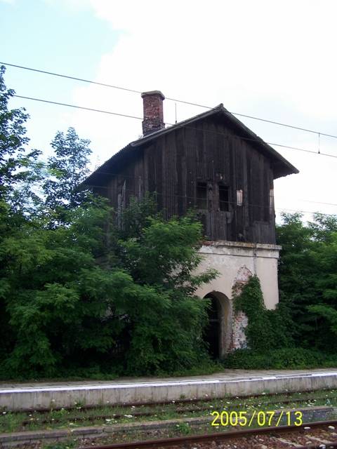 PKP Rudnik nad Sanem. Była wieża wodna. Widok od strony peronu; w prawo dworzec, w lewo Stalowa Wola.