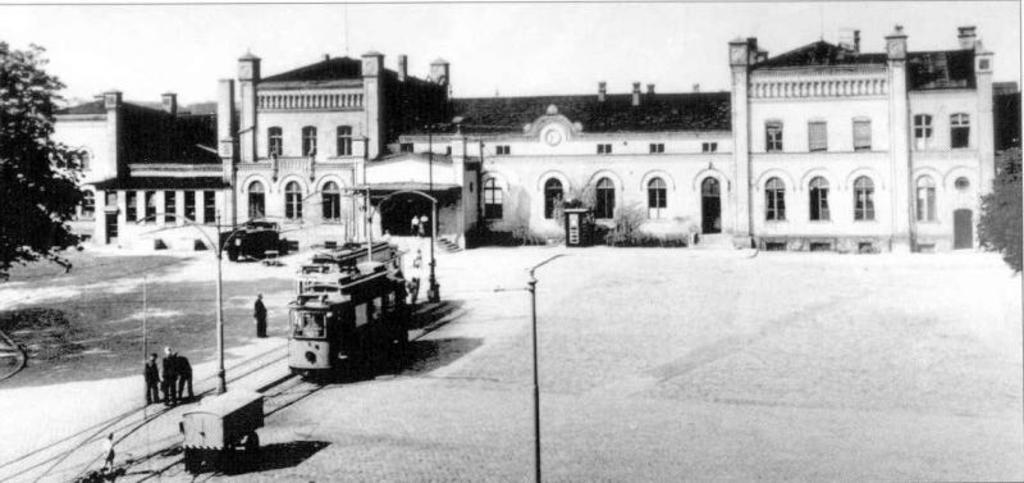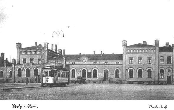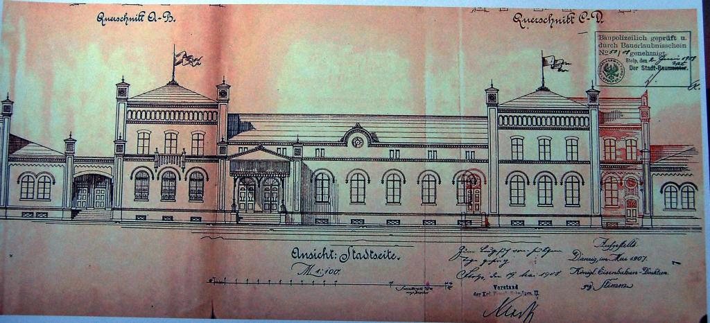 Rzut frontowej elewacji nieistniejącego dworca kolejowego w Słupsku. Reprodukcja pochodzi ze zbiorów Kolejowej Izby Tradycji SITK w Słupsku.