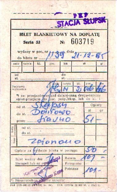 Bilet blankietowy (Słupsk-Darłowo) wydany w pociągu dnia 21.12.1985 r.