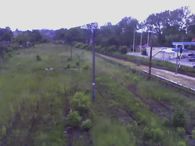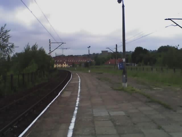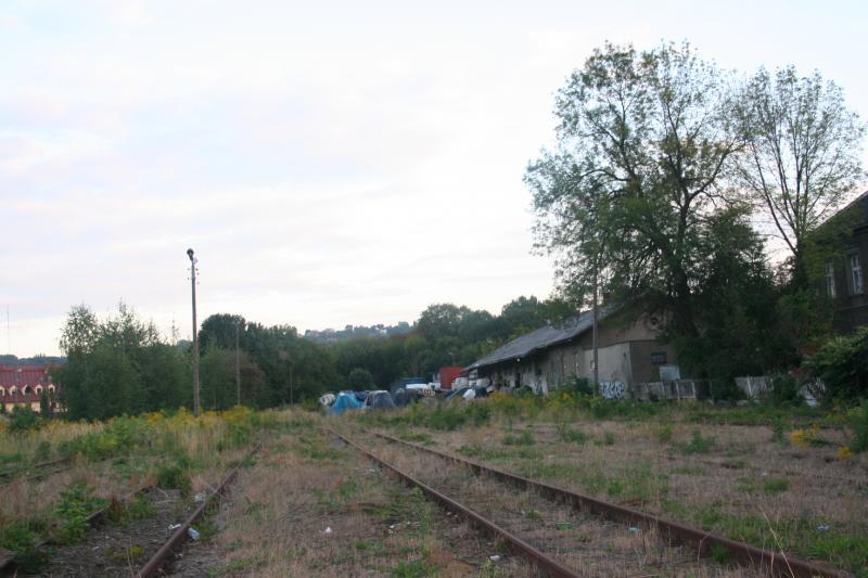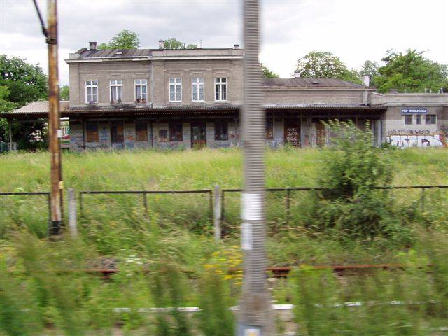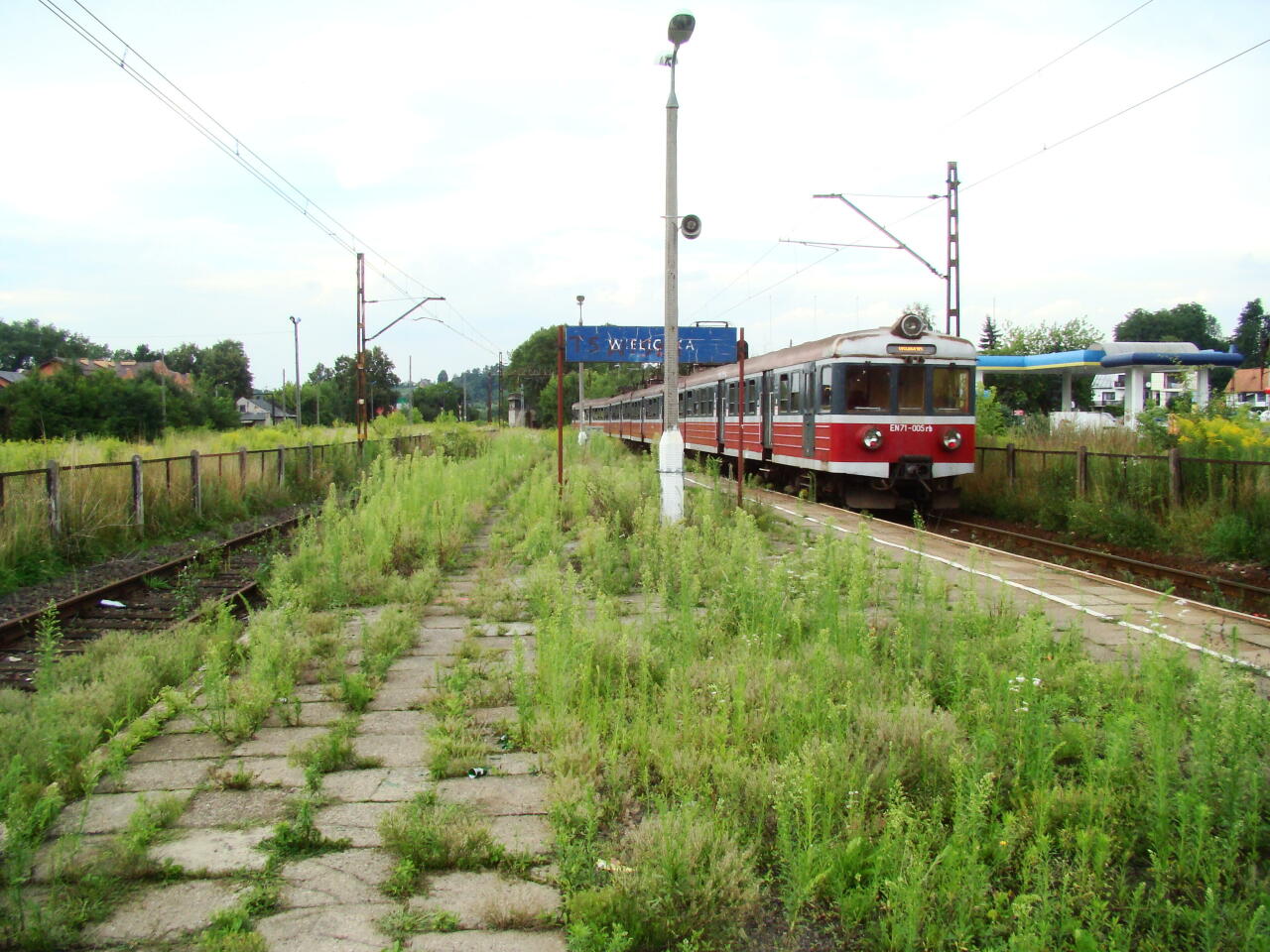 Zarośnięta stacja w Wieliczce. W tle budynek dworca. W lewo Wieliczka Rynek, w prawo Kraków.