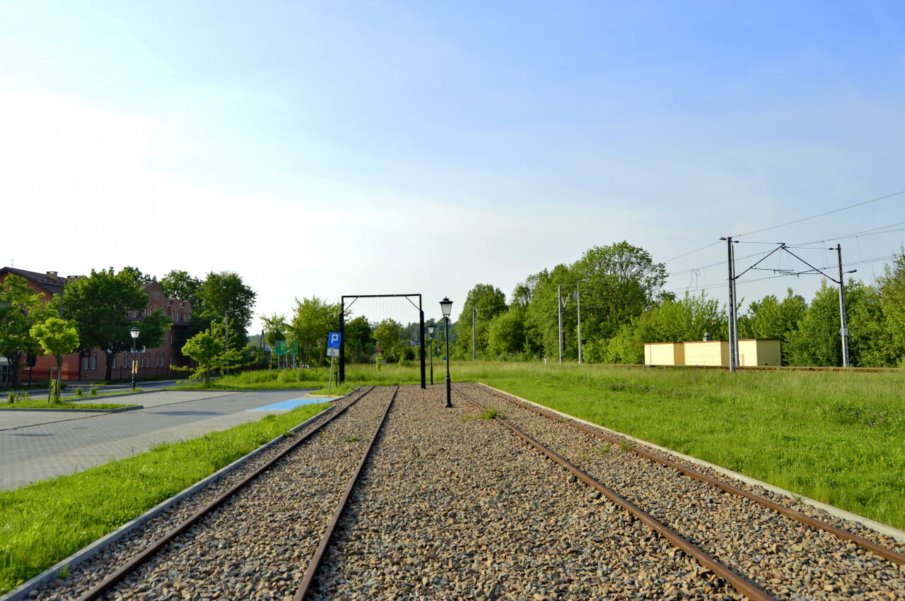 Wieliczka Park. Dawna równia stacyjna oraz pozostawiony fragment torów dodatkowych. Po prawej stronie budynek dworca.