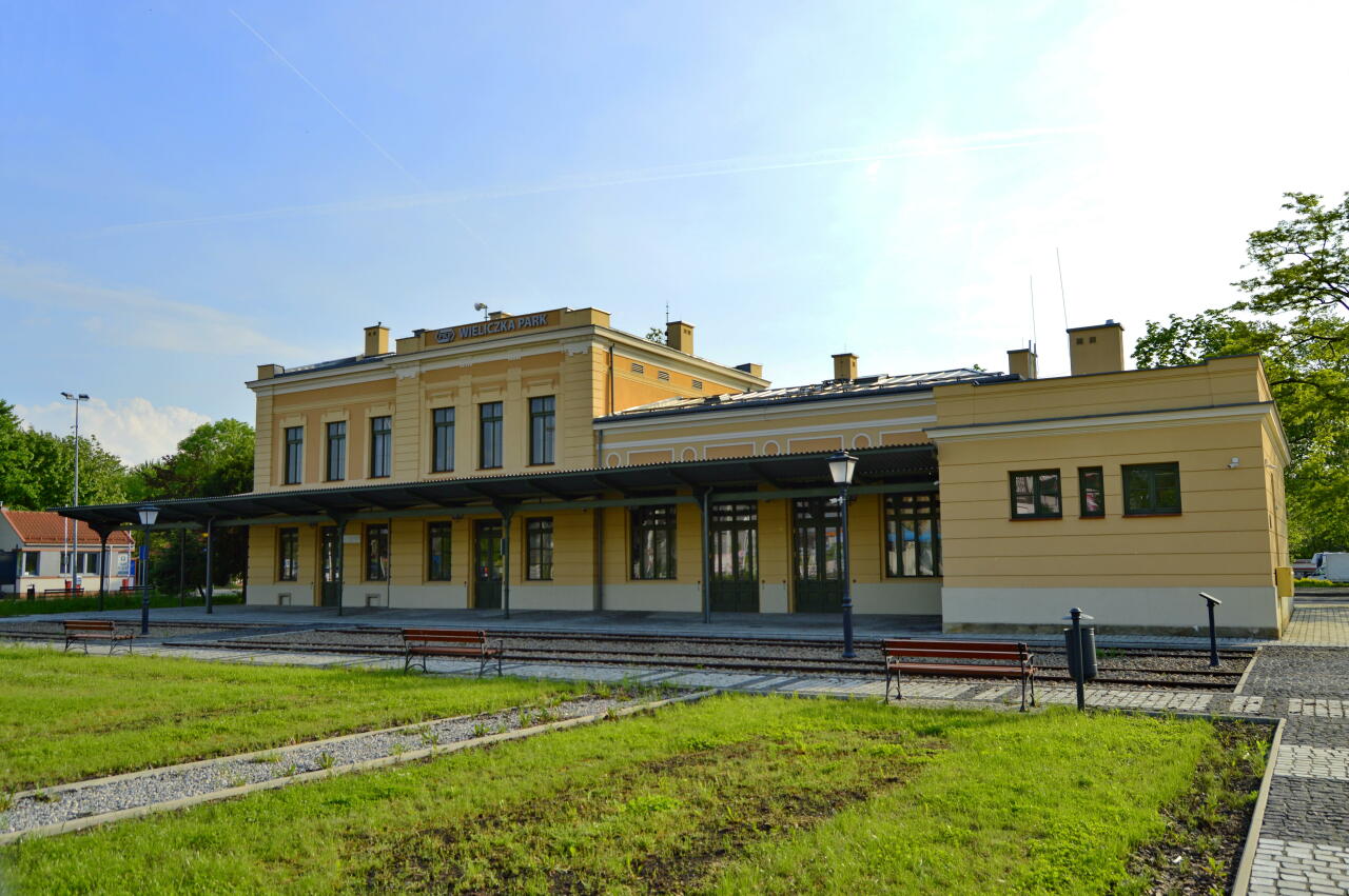 Wieliczka Park. Budynek dworca od strony ulicy.