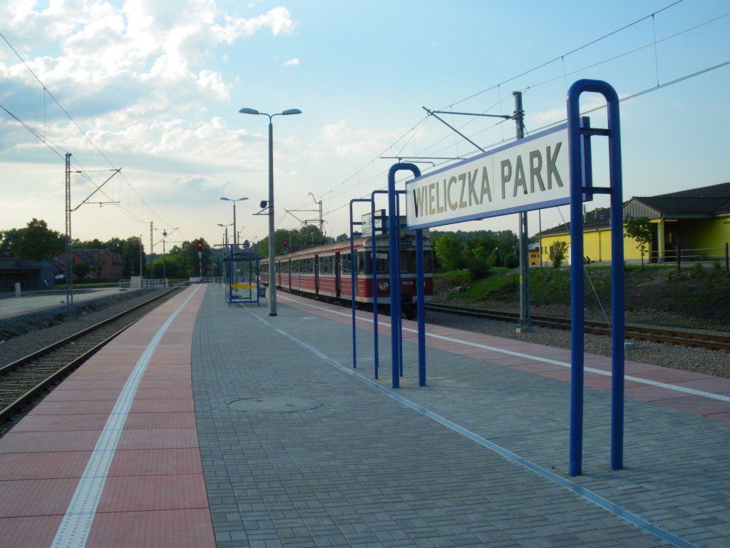 Wieliczka Park. Widok z peronu w kierunku przystanku Wieliczka Rynek-Kopalnia.