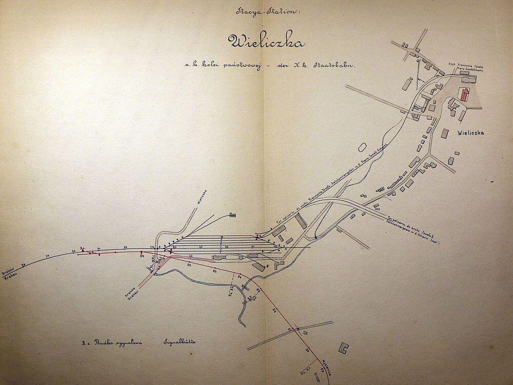 Stacja w Wieliczce, budynek dworca i perony. W lewo Wieliczka Rynek, w prawo Kraków.