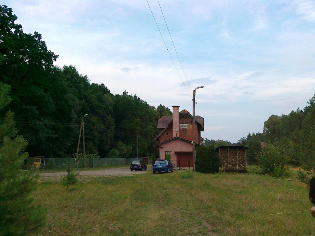 Kolejowy budynek mieszkalny (Kujan 27) i pobliski budynek gospodarczy. Obiekty widoczne od strony miejsca w którym kiedyś były tory. W lewo Więcbork/Terespol Pomorski, w prawo Złotów.