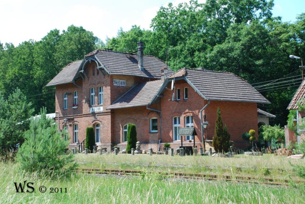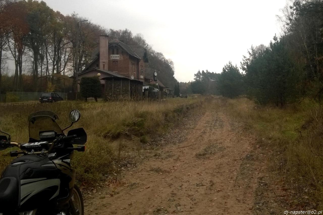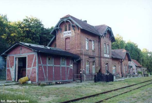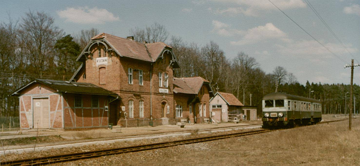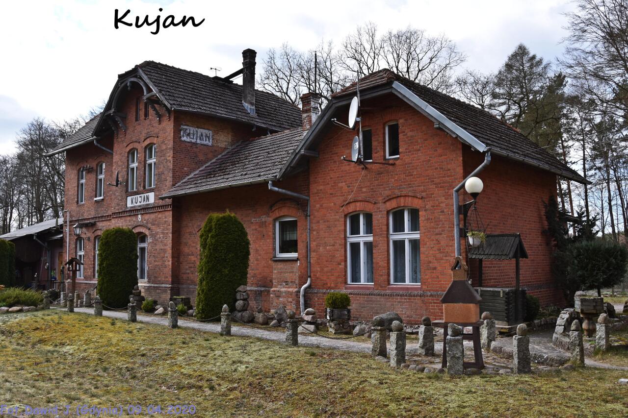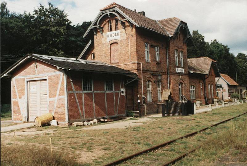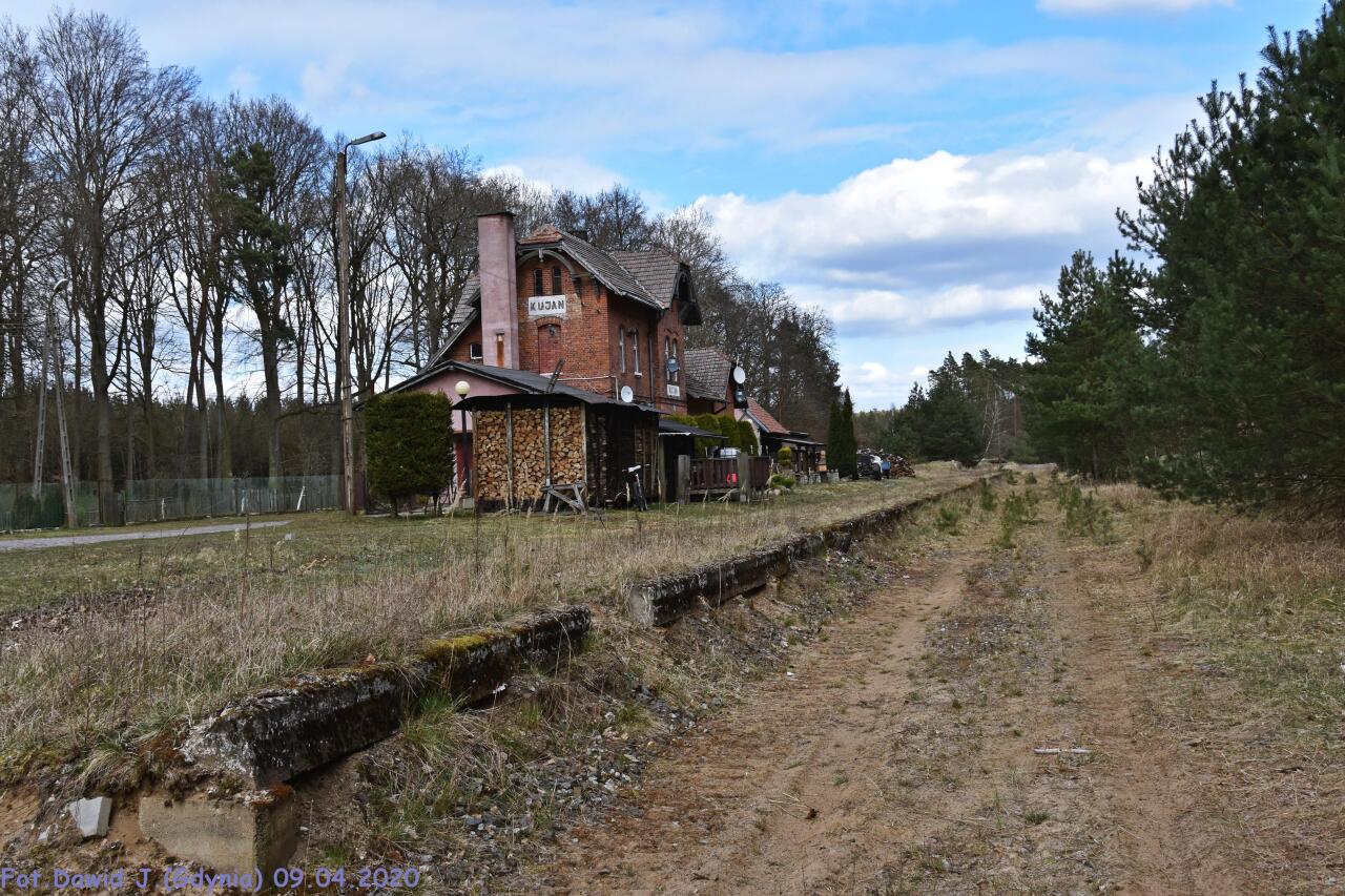 Kujan. W tle magazyn towarowy i dawny budynek dworca, z prawej peron. Torowisko porastają dwumetrowe świerki. Brak jakiegokolwiek ruchu pociągów.
