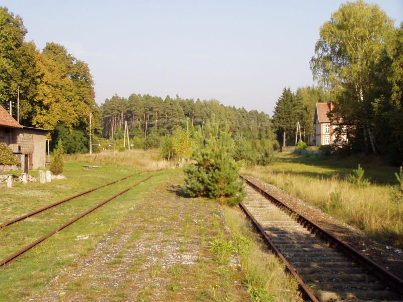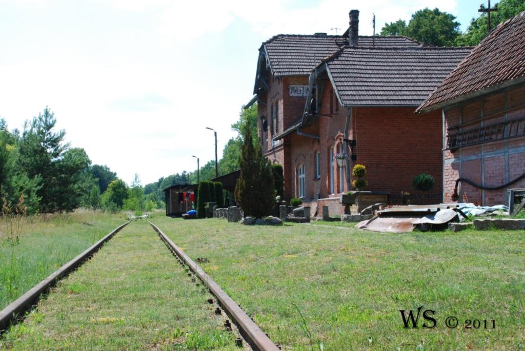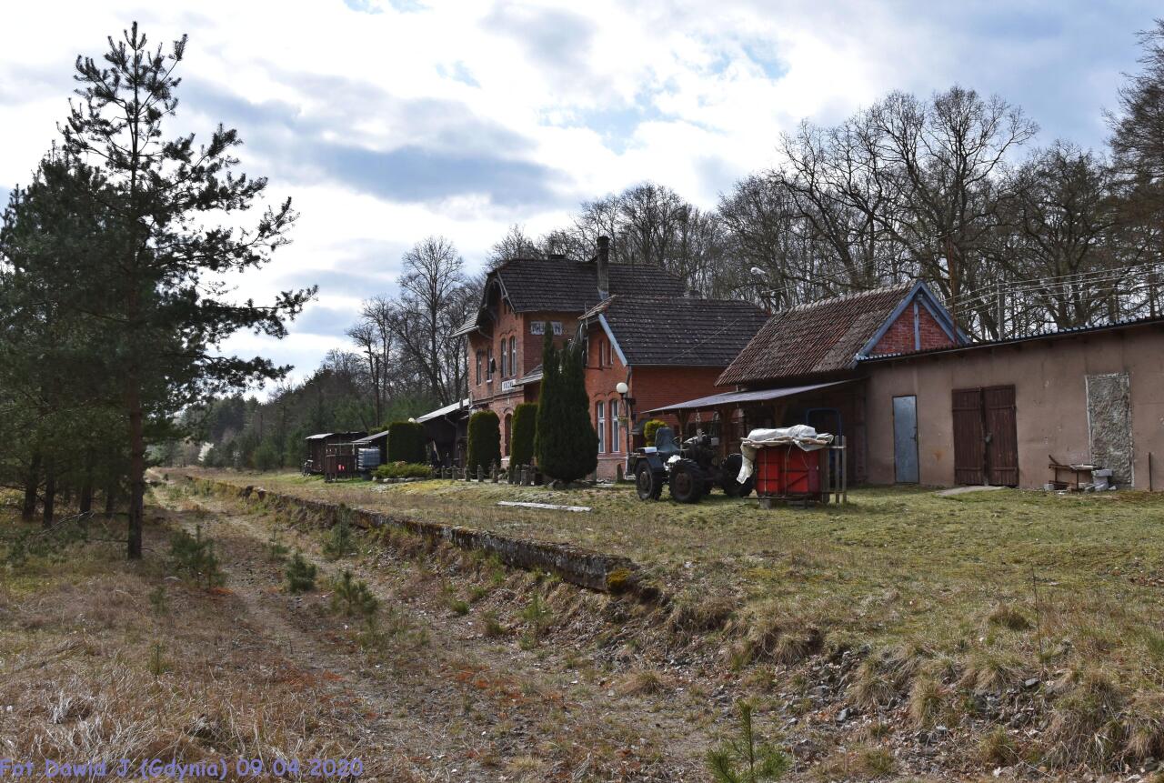 Widok na miejsce w którym kiedyś były tory, dawny peron i w kierunku Złotowa. Dawny budynek dworcowy i WC, znajdują się po prawej stronie.