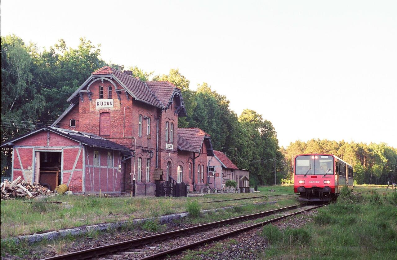 Dawny budynek dworca na dawnej stacji Kujan. W tle SA101/121-002, jako pociąg specjalny. Widok w kierunku Więcborka.