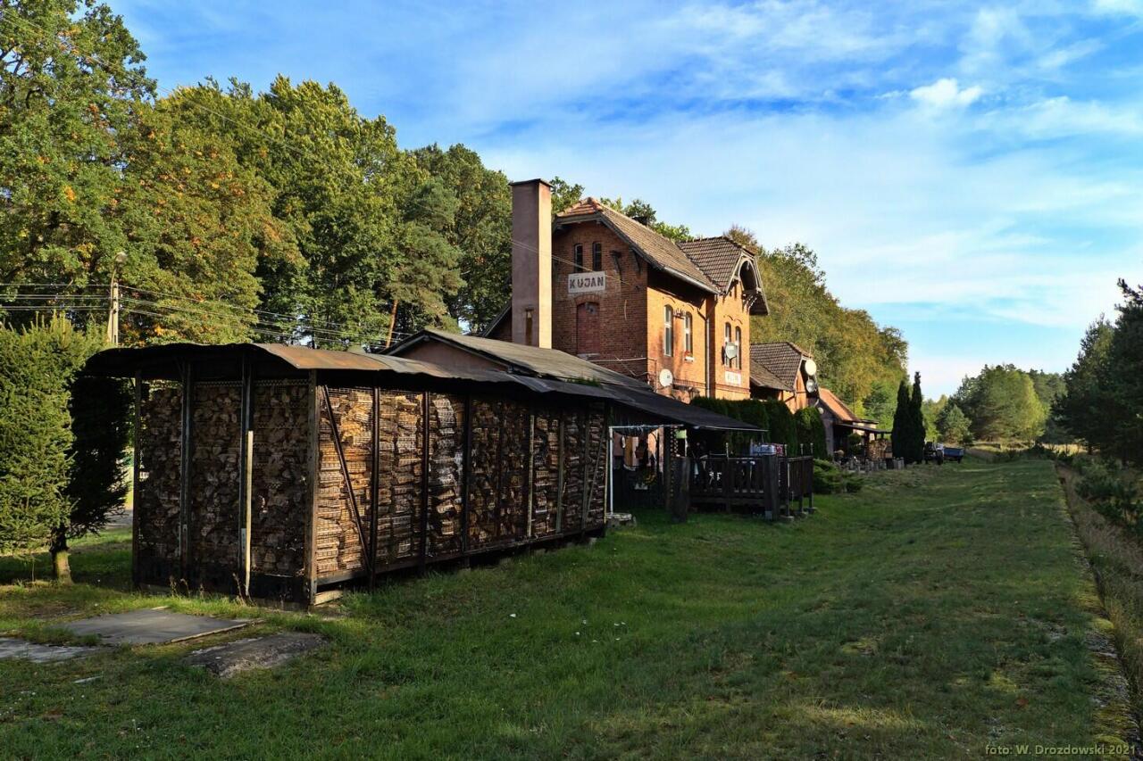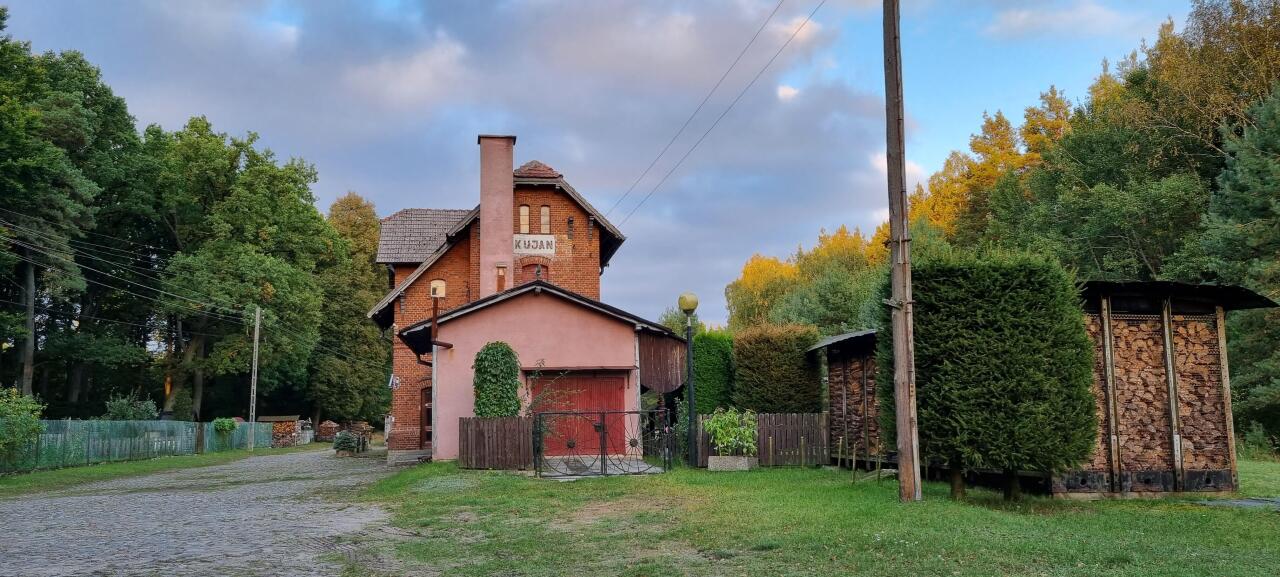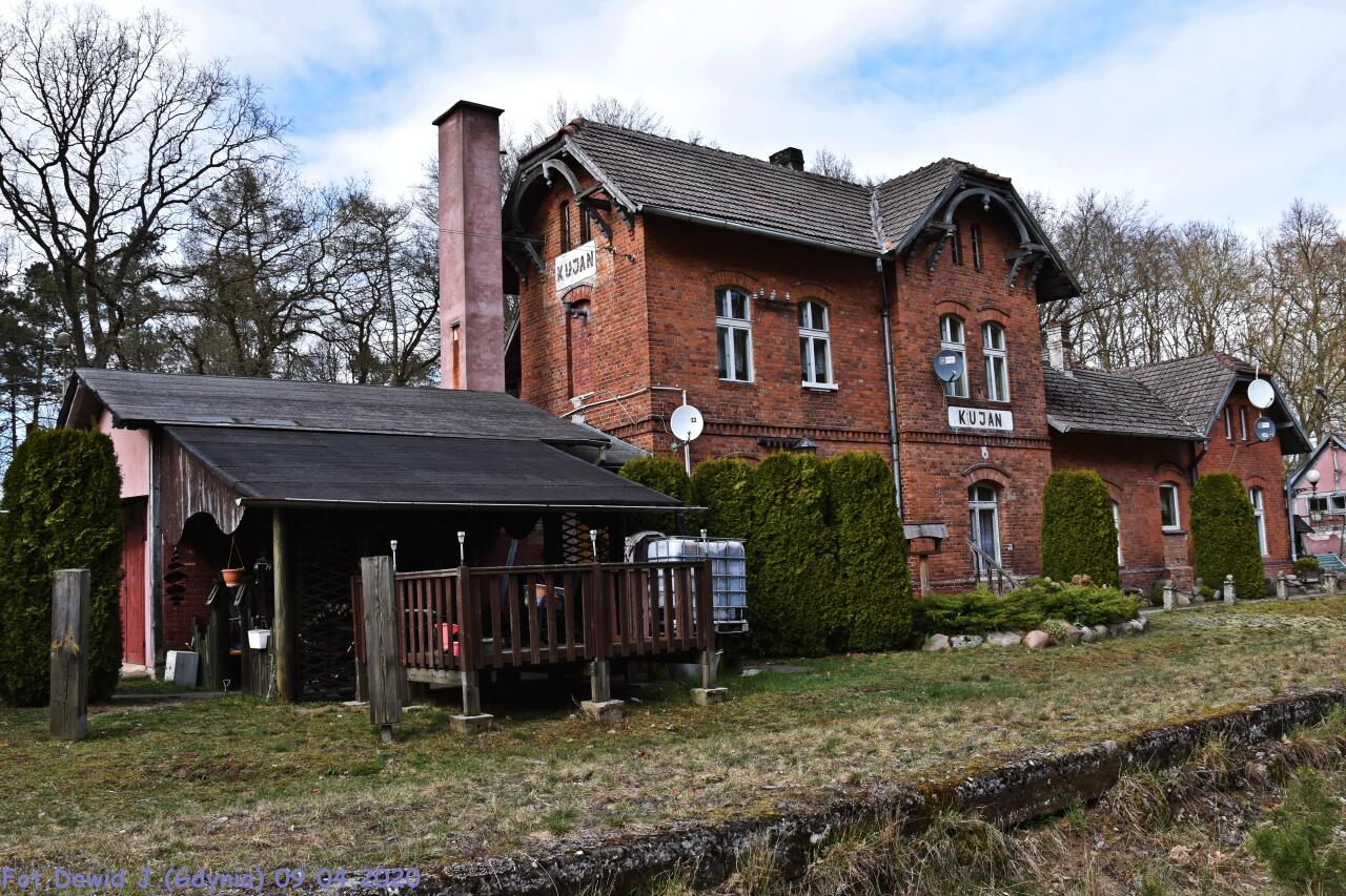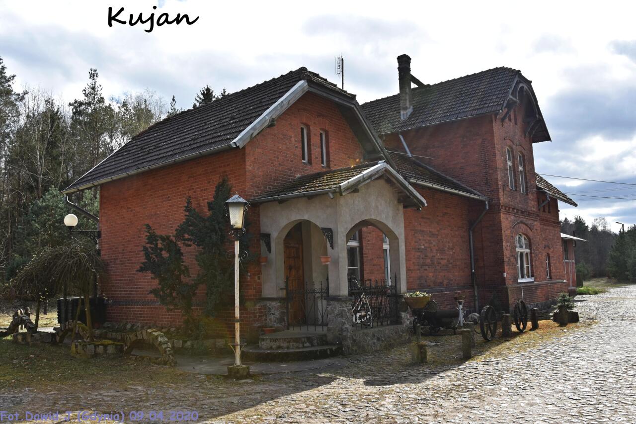 Kolejowy budynek mieszkalny (Kujan 27) i pobliski budynek gospodarczy. Obiekty widoczne od strony miejsca w którym kiedyś były tory. Podobne obiekty występują m.in. w Nowej Świętej. Widok w kierunku Więcborka/Terespola Pomorskiego.