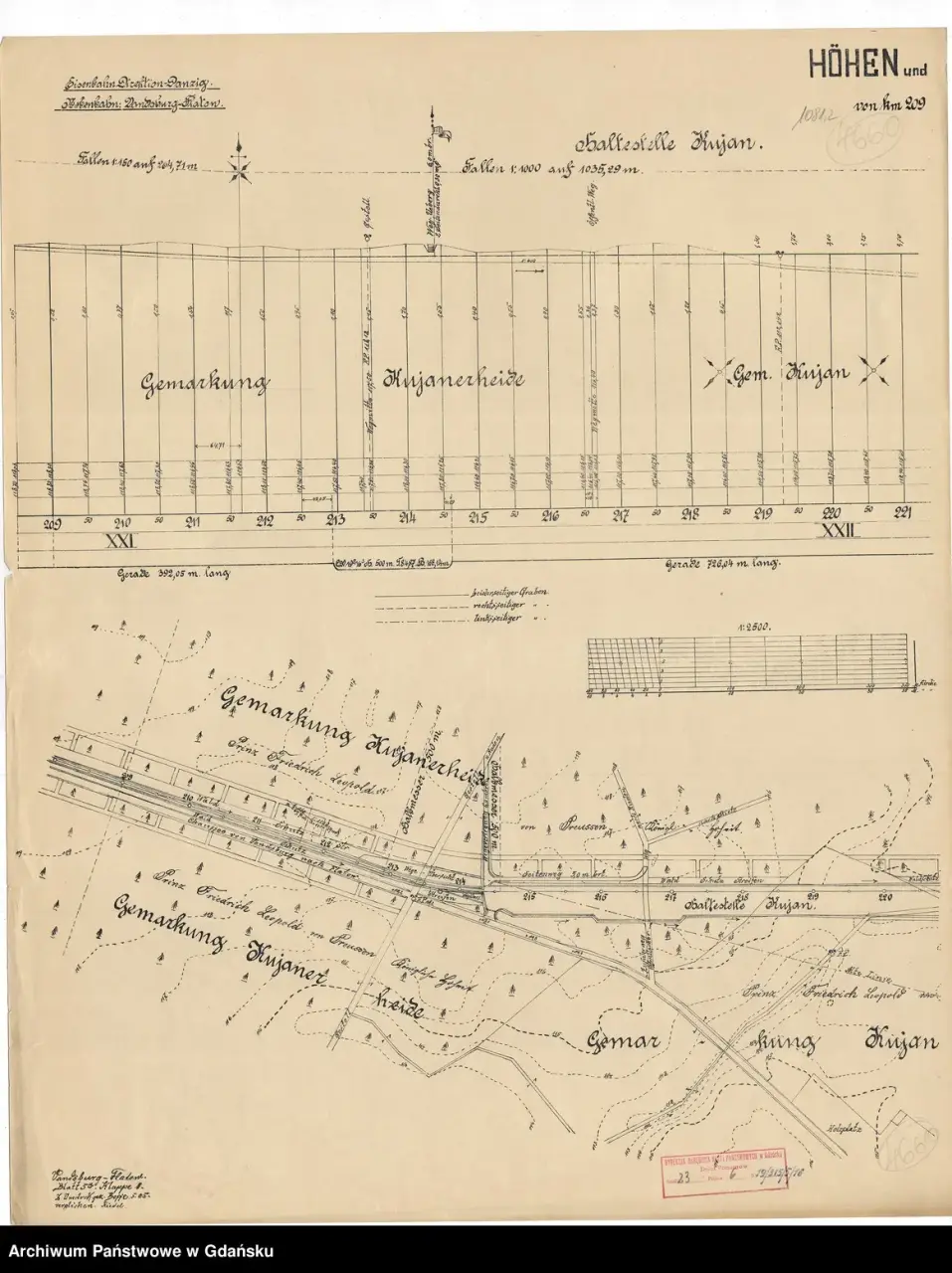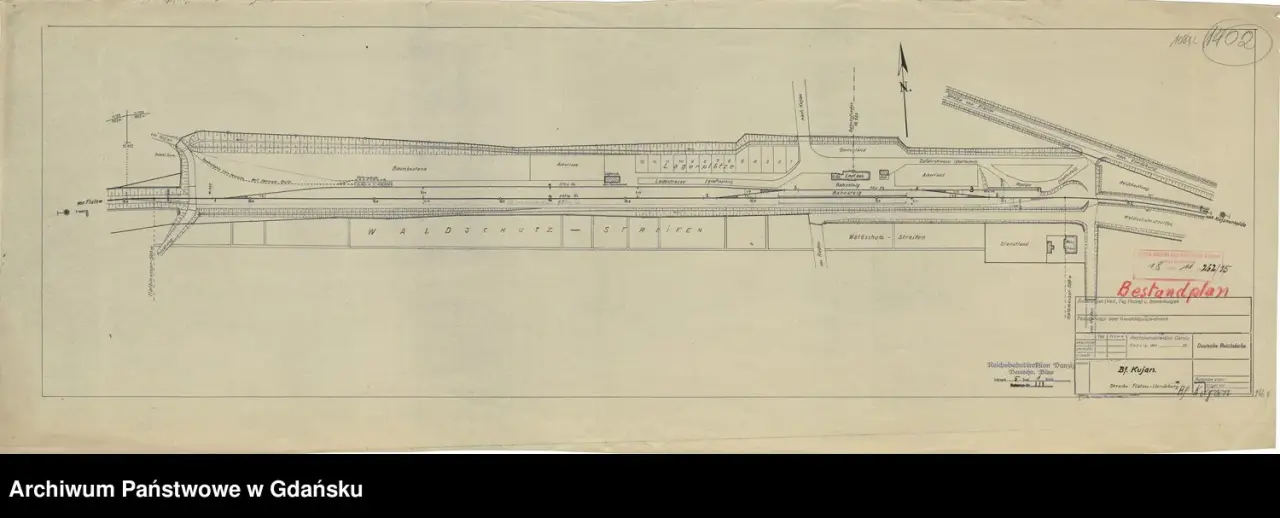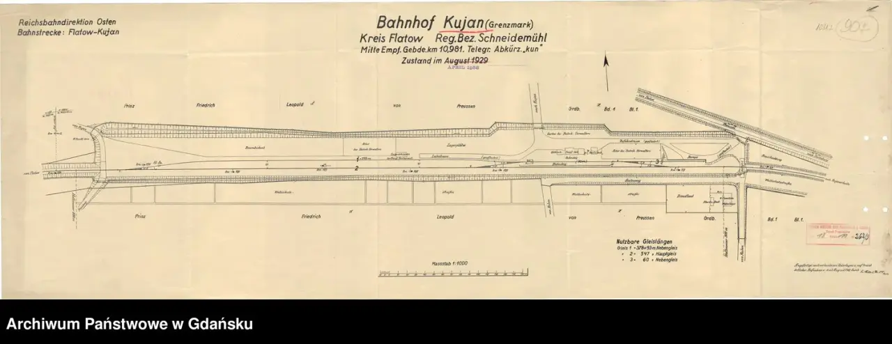 Plan budowy linii, odcinek że stacją Kujan. Stan na maj 1905 rok. Materiał zasobów Archiwum Państwowego w Gdańsku.