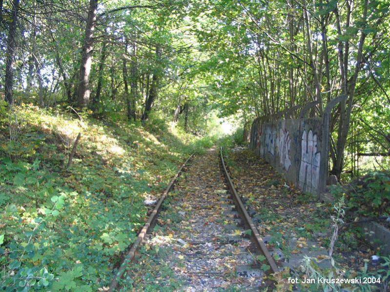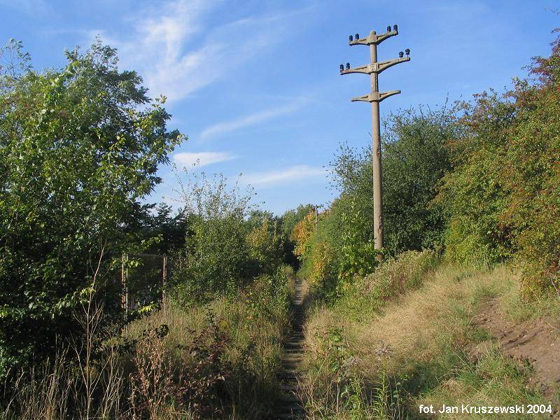 Bocznica, po lewej nasyp z rozebranym torowiskiem do Kartuz, a obok zabytkowy betonowy slup energetyczny.