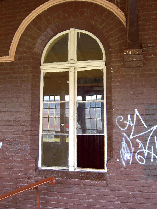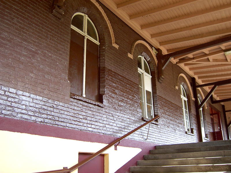 Sławno-zespół dworca kolejowego z 1869 roku.Okna w południowej części dworca,przy wejściu do tunelu podziemnego;zachowane zdobienia ceglane i stolarka okienna.Fot.D.Naczk.