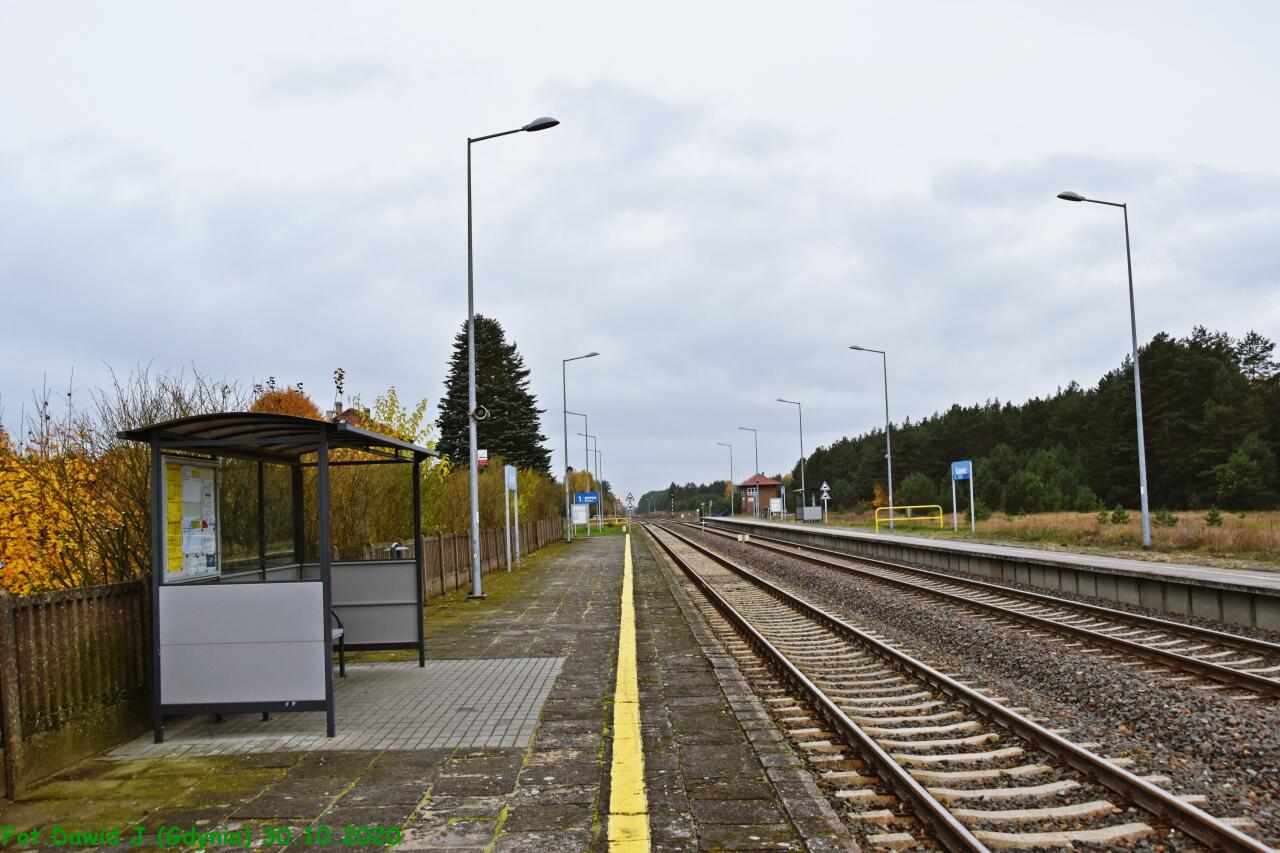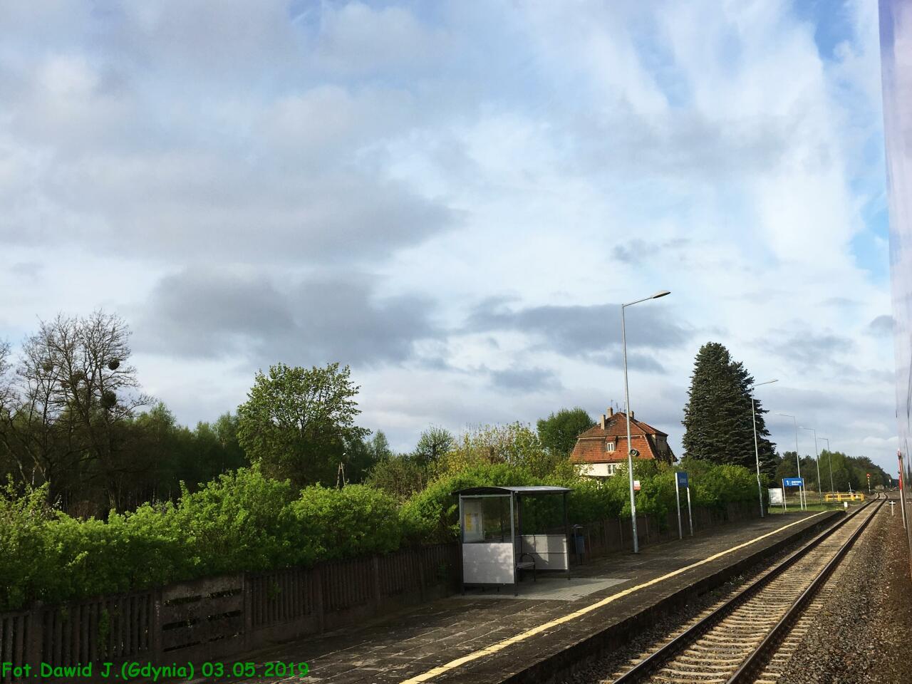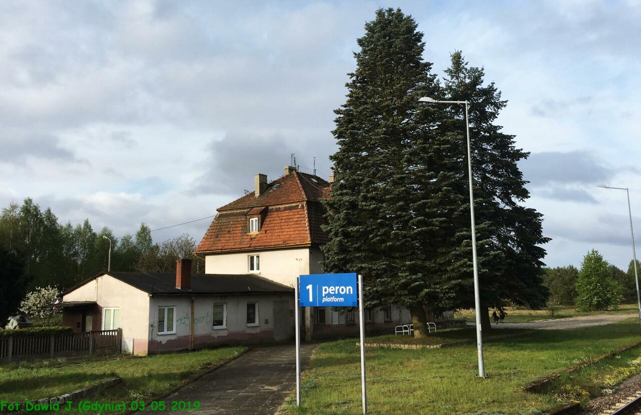 Widok z peronu 1 w kierunku Czerska/Tczewa. Tablica z nazwą stacji.