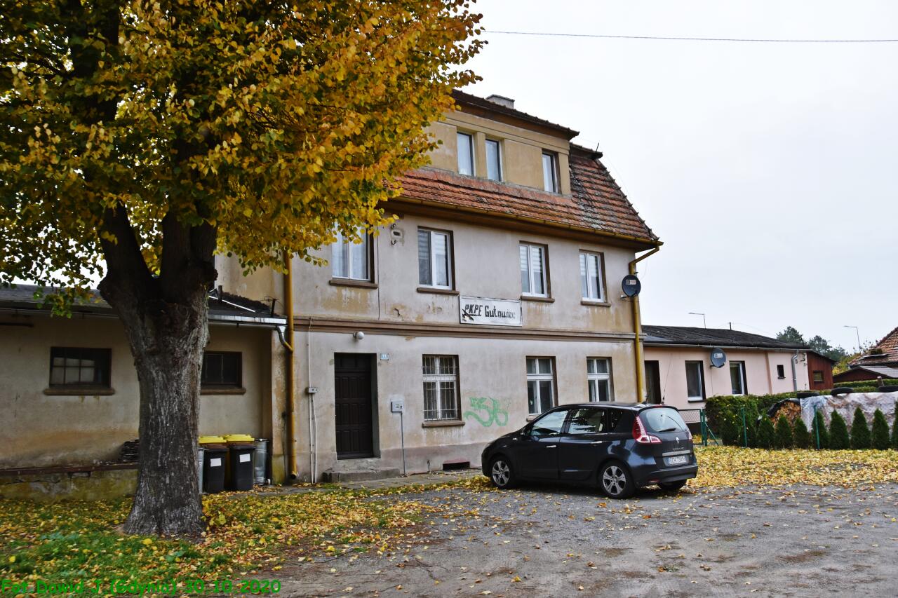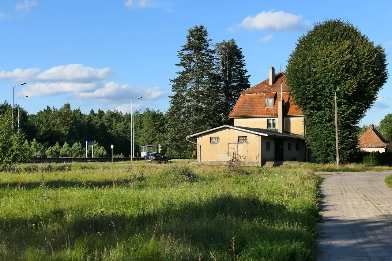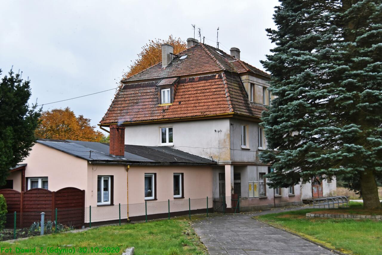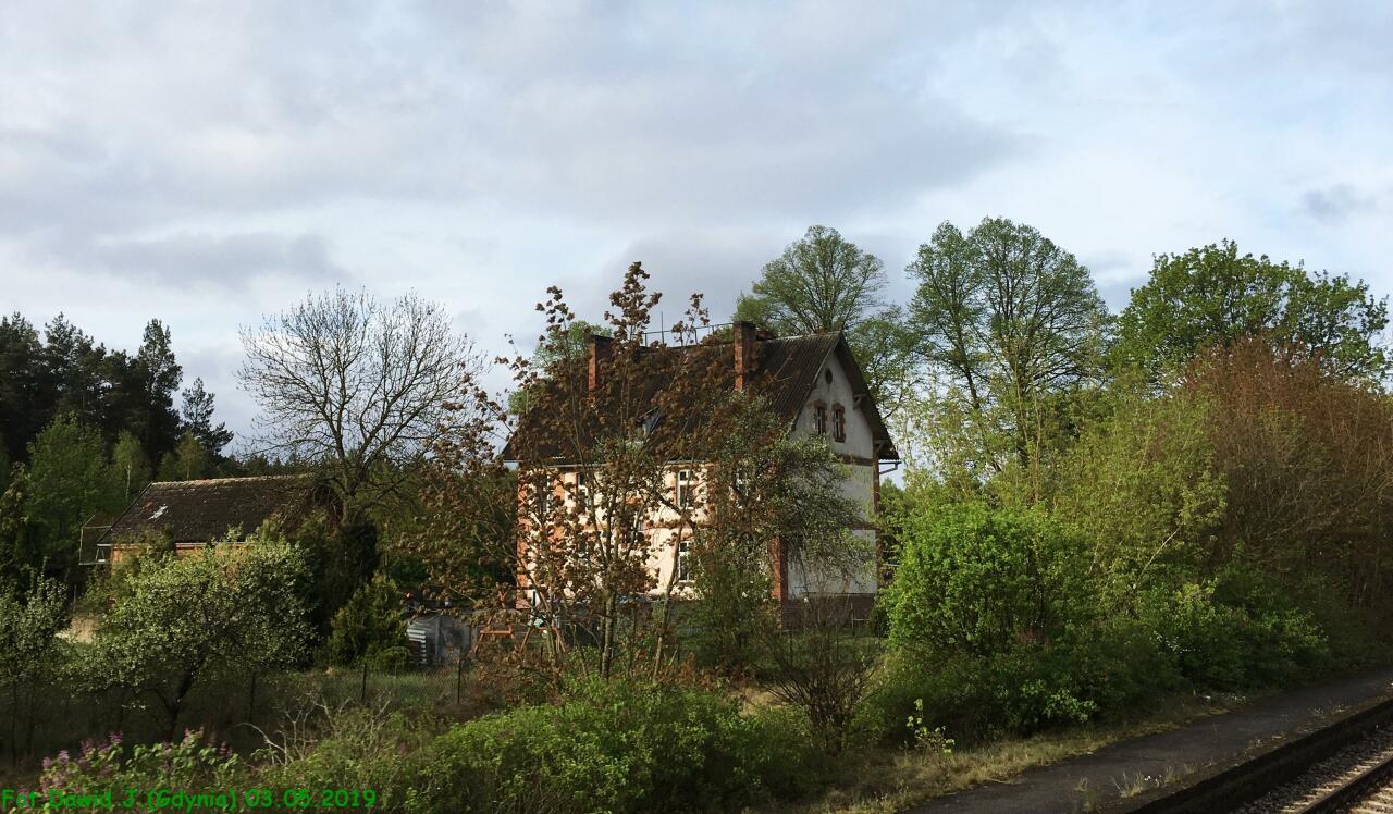 Kolejowy budynek mieszkalny (ul. Dworcowa 17) i pobliski budynek gospodarczy. Obiekty widoczne od strony podjazdu. Widok w kierunku Czerska/Tczewa.