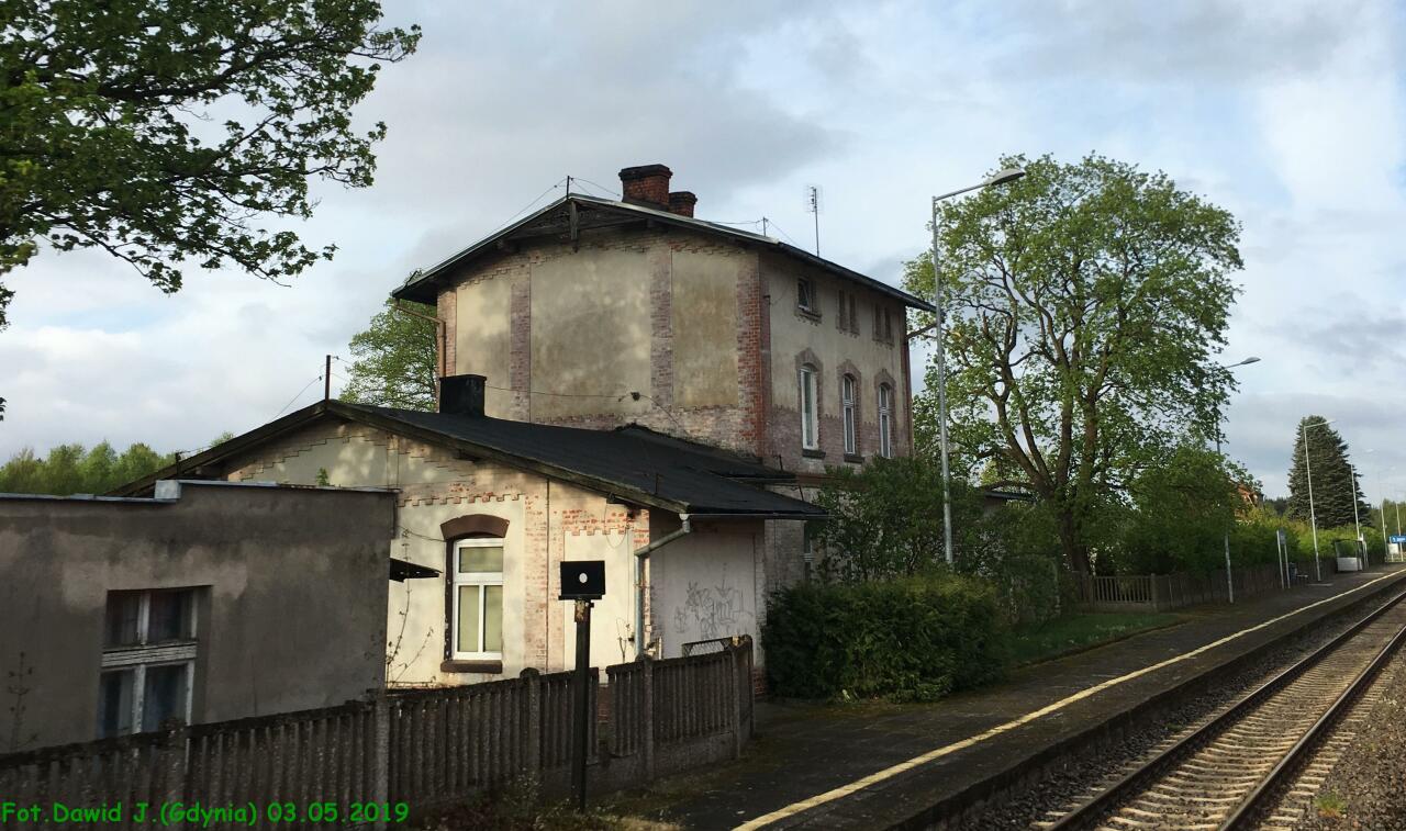 Widok z peronu 1 w kierunku Czerska/Tczewa. Kolejowy budynek mieszkalny (ul. Dworcowa 15) znajduje się po prawej stronie.
