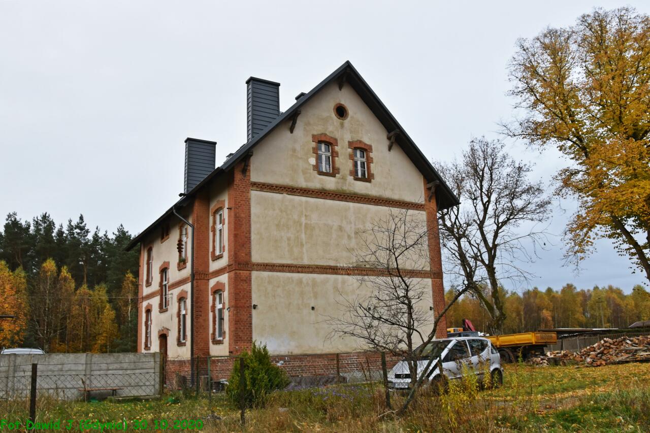 Kolejowy budynek mieszkalny (ul. Dworcowa 17) i pobliski budynek gospodarczy. Obiekty widoczne od strony torów. Widok w kierunku Chojnic/Kostrzyna.