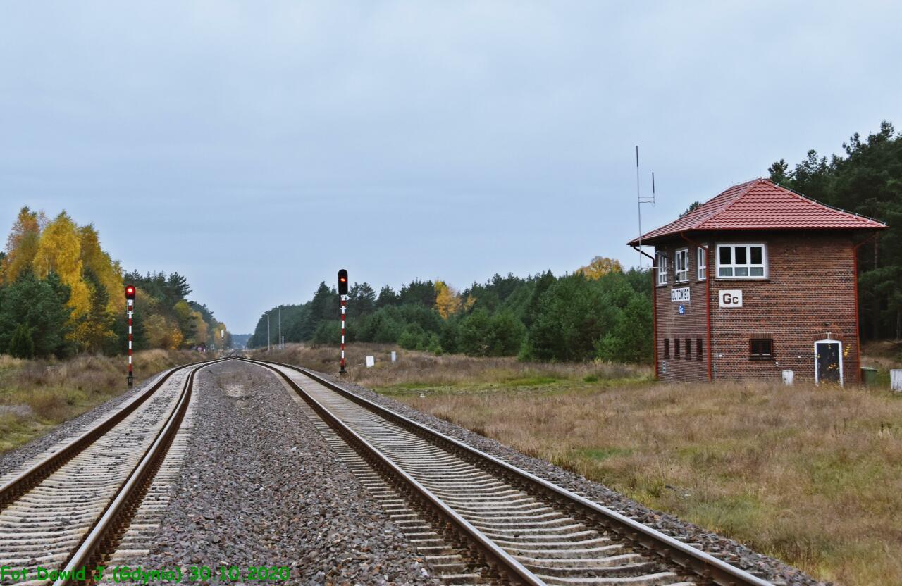 Wyjazd ze stacji w kierunku Chojnic/Kostrzyna. Semafory wyjazdowe. Budynek nastawni "Gc" znajduje się po prawej stronie.
