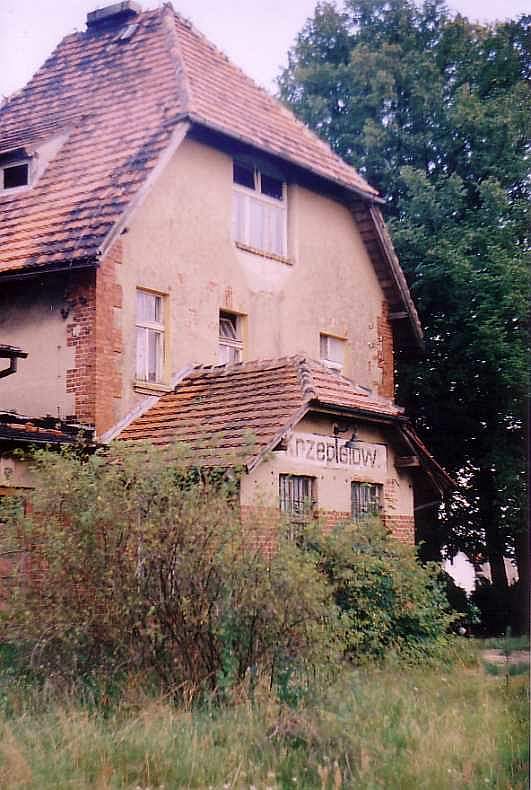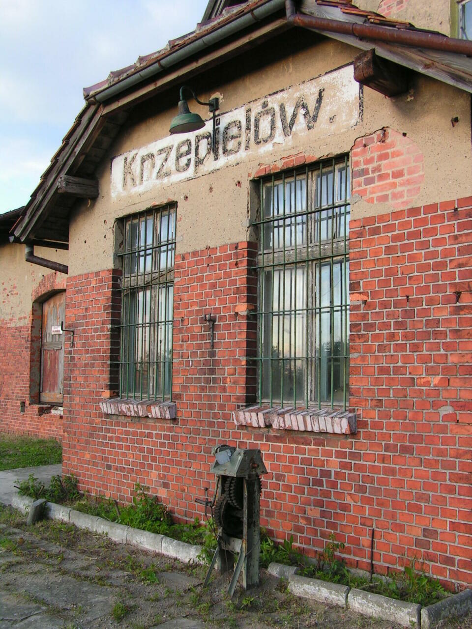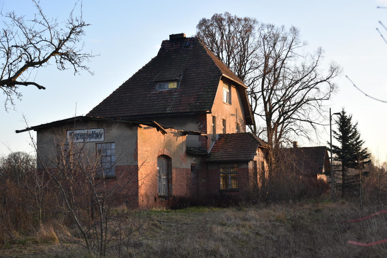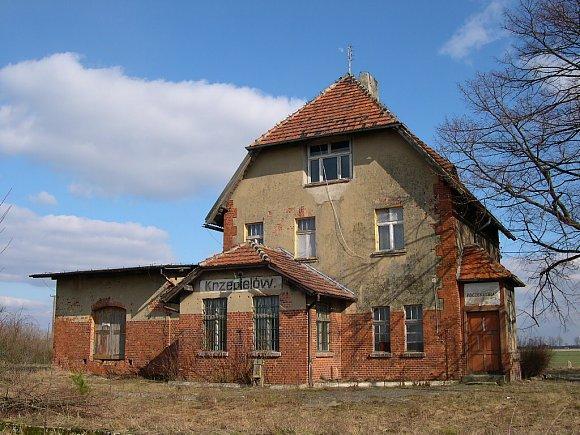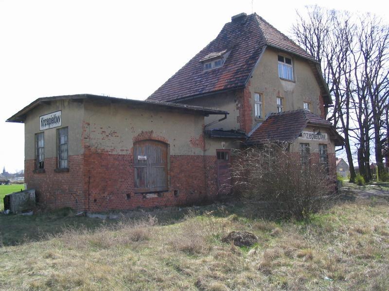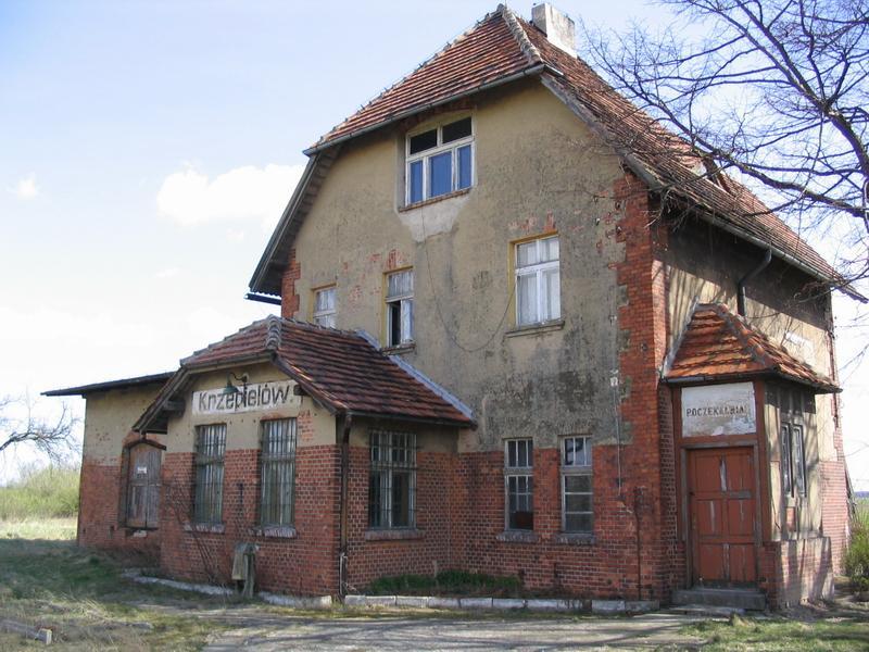 Budynek dworca w Krzepielowie; widok od strony podjazdu w kierunku południowo-zachodnim; w lewo Grodziec Mały/Głogów, w prawo Lipinka Głogowska/Sława Śląska.