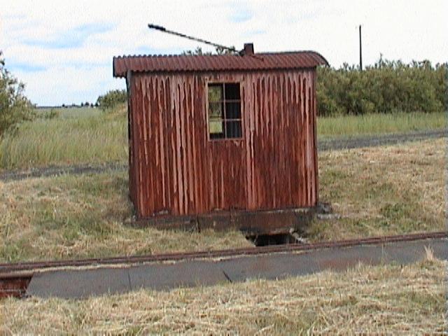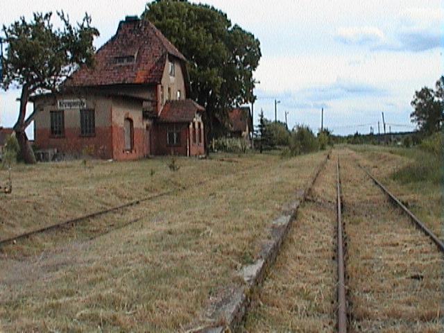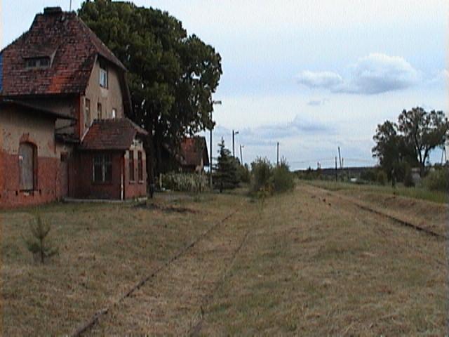 Budynek wc i gospodarczy obok budynku stacji. Podobny był w Kotli. Widok w kierunku wschodnim; z prawej strony (poza kadrem) budynek dworca.