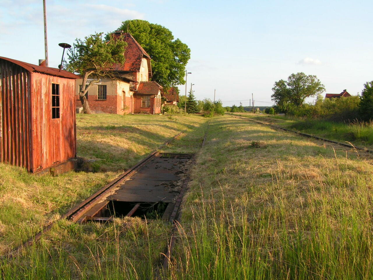 Dawna stacja kolejowa w Krzepielowie, widok w kierunku wyjazdu do Lipinki Głogowskiej/Sławy Śląskiej (północ). Z prawej nieczynny, opuszczony dworzec.