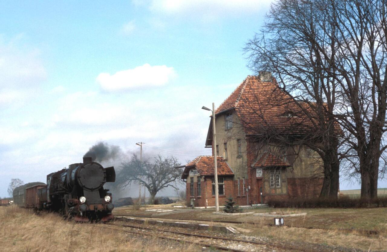 Parowóz z wagonem towarowym i osobowym w Krzepielowie. Z prawej budynek dworca z przybudówka mieszczącą dawniej nastawnię dysponującą. Widok od strony Grodźca Małego/Głogowa.
