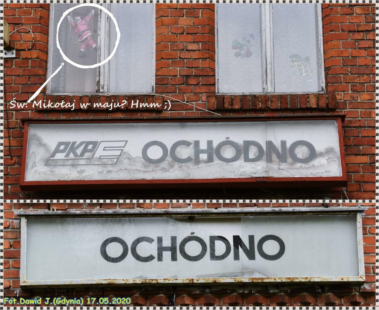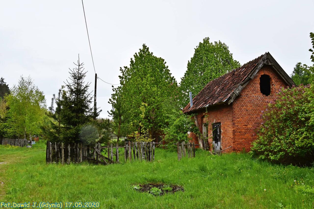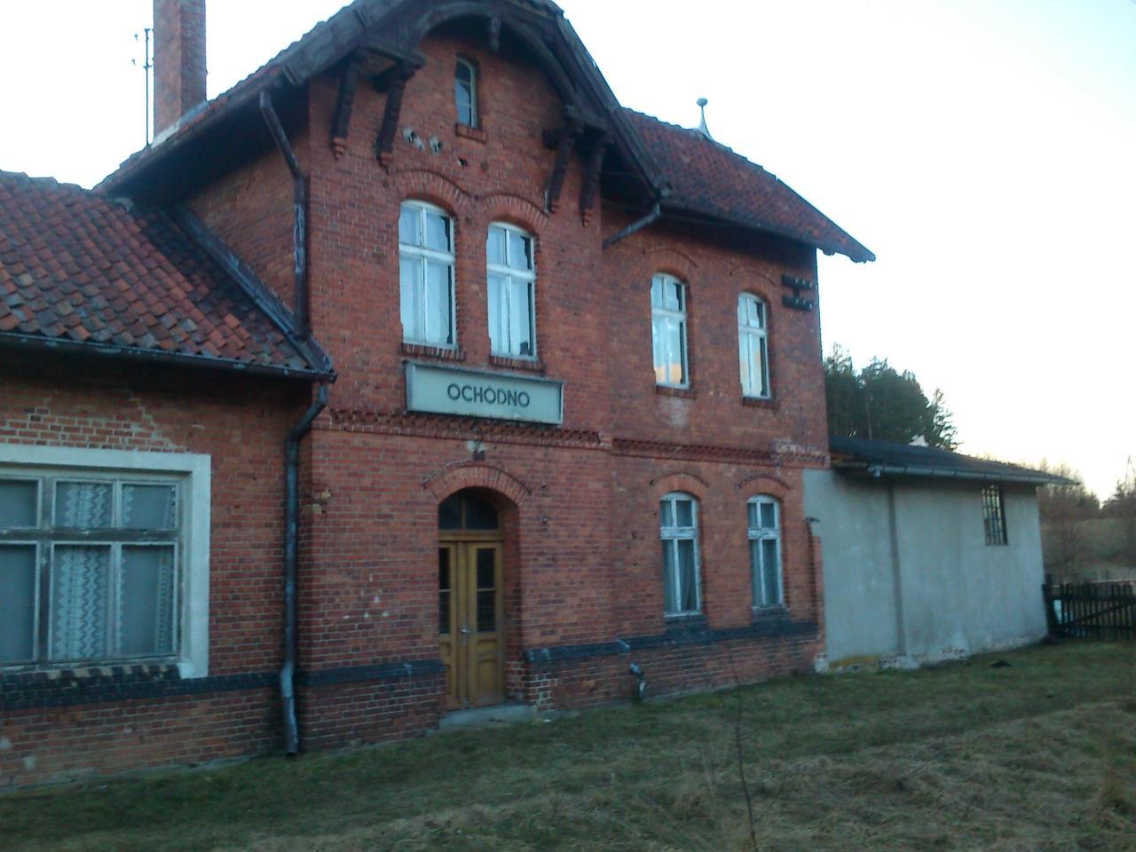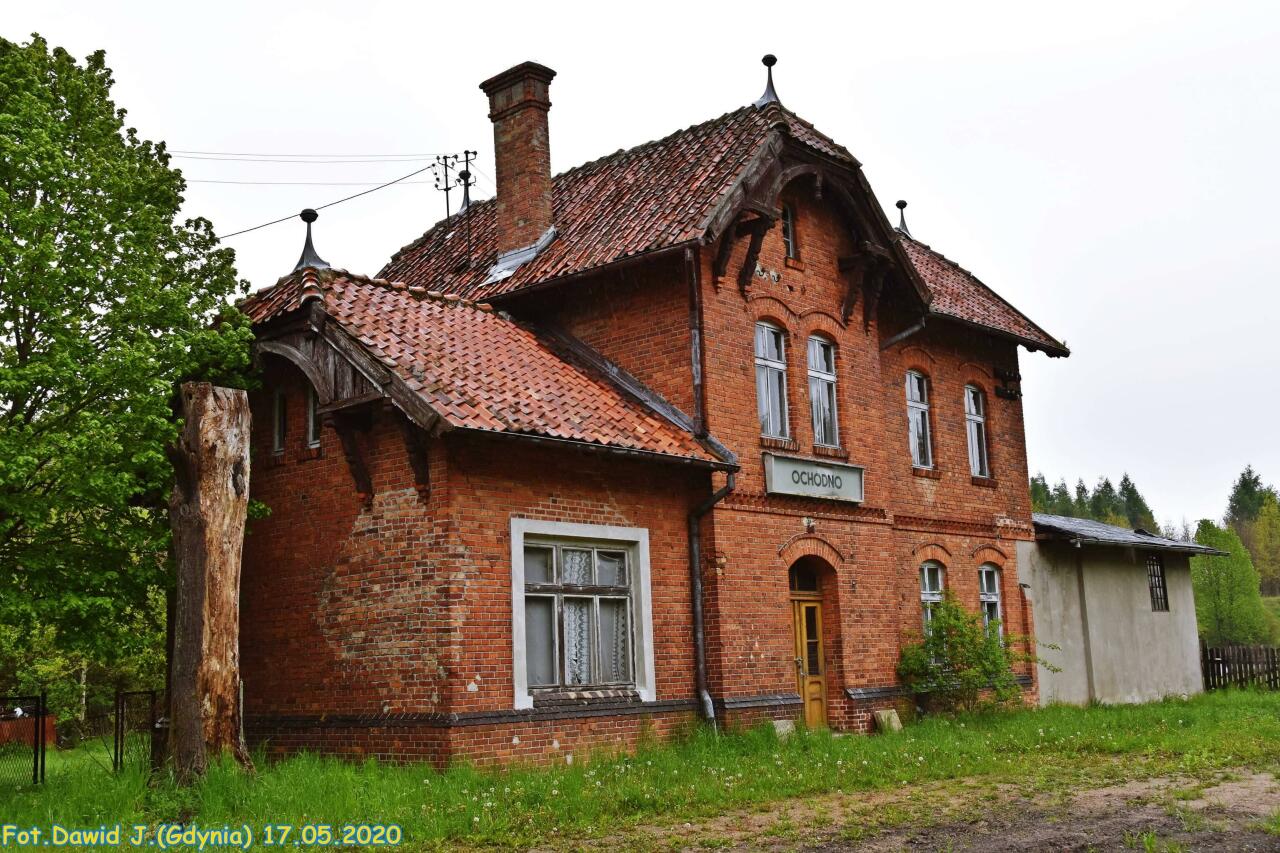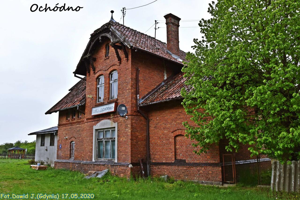 Kolejowy budynek mieszkalny (Ochódno 7) i pobliski budynek gospodarczy. Obiekty widoczne od strony miejsca w którym kiedyś znajdowały się tory. W lewo Szczytno, w prawo Biskupiec Reszelski.