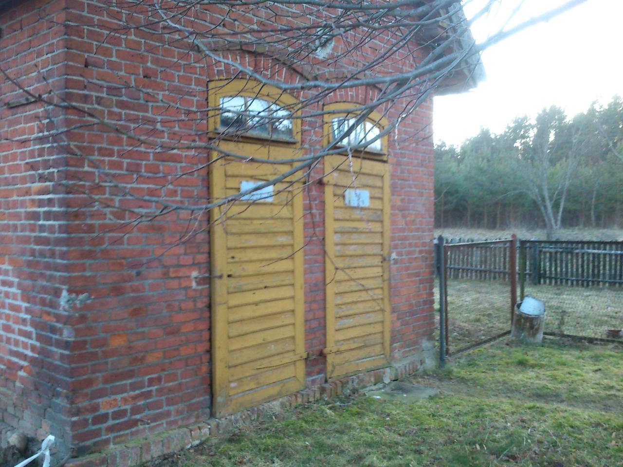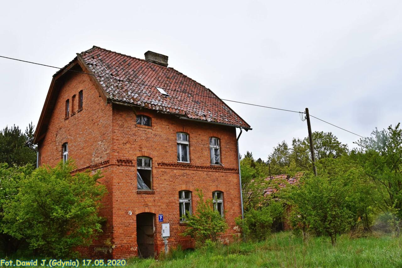 Toalety i dawny budynek dworca. Widok od strony wjazdu z Biskupca.