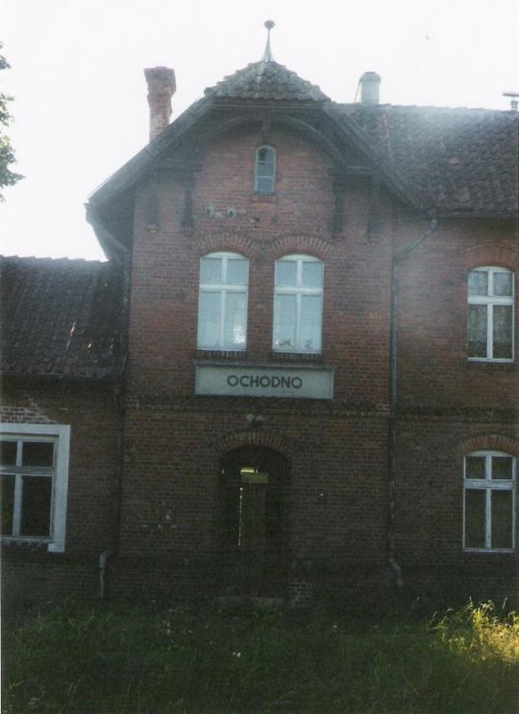 Kolejowy budynek mieszkalny (Ochódno 7) widoczny od strony podjazdu. W lewo Biskupiec Reszelski, w prawo Szczytno.