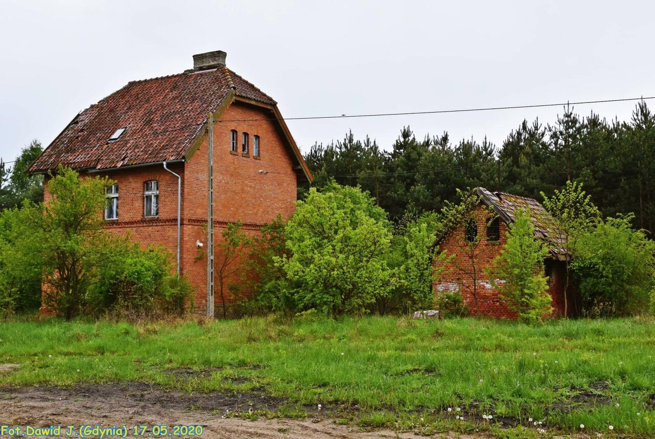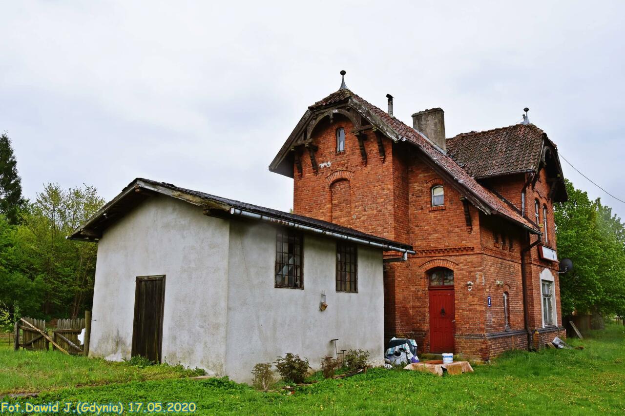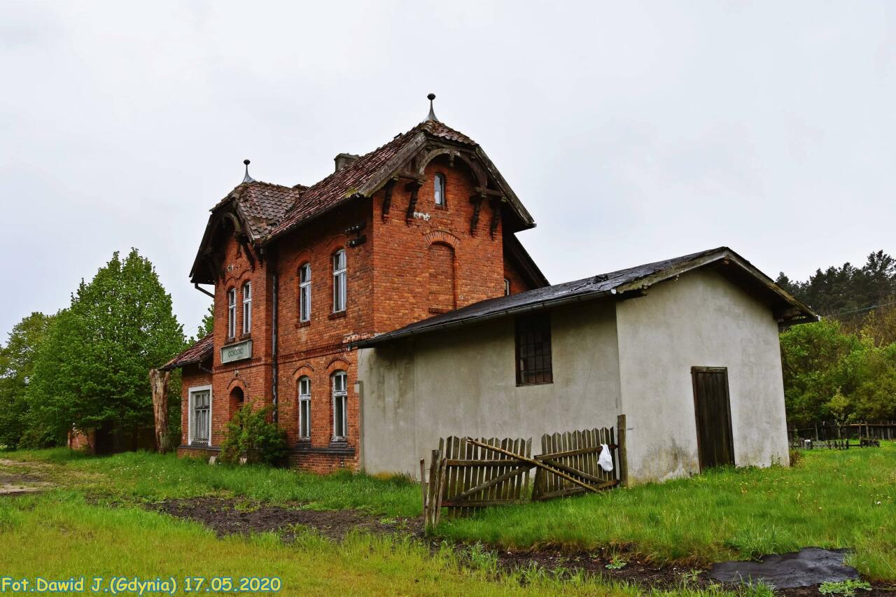 Budynek dworcowy z przyległym budynkiem magazynu widoczny od strony miejsca w którym kiedyś znajdowały się tory. W lewo Szczytno, w prawo Biskupiec Reszelski.