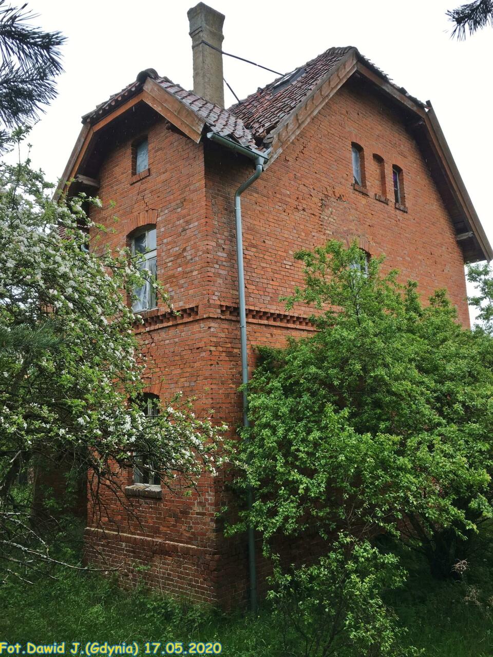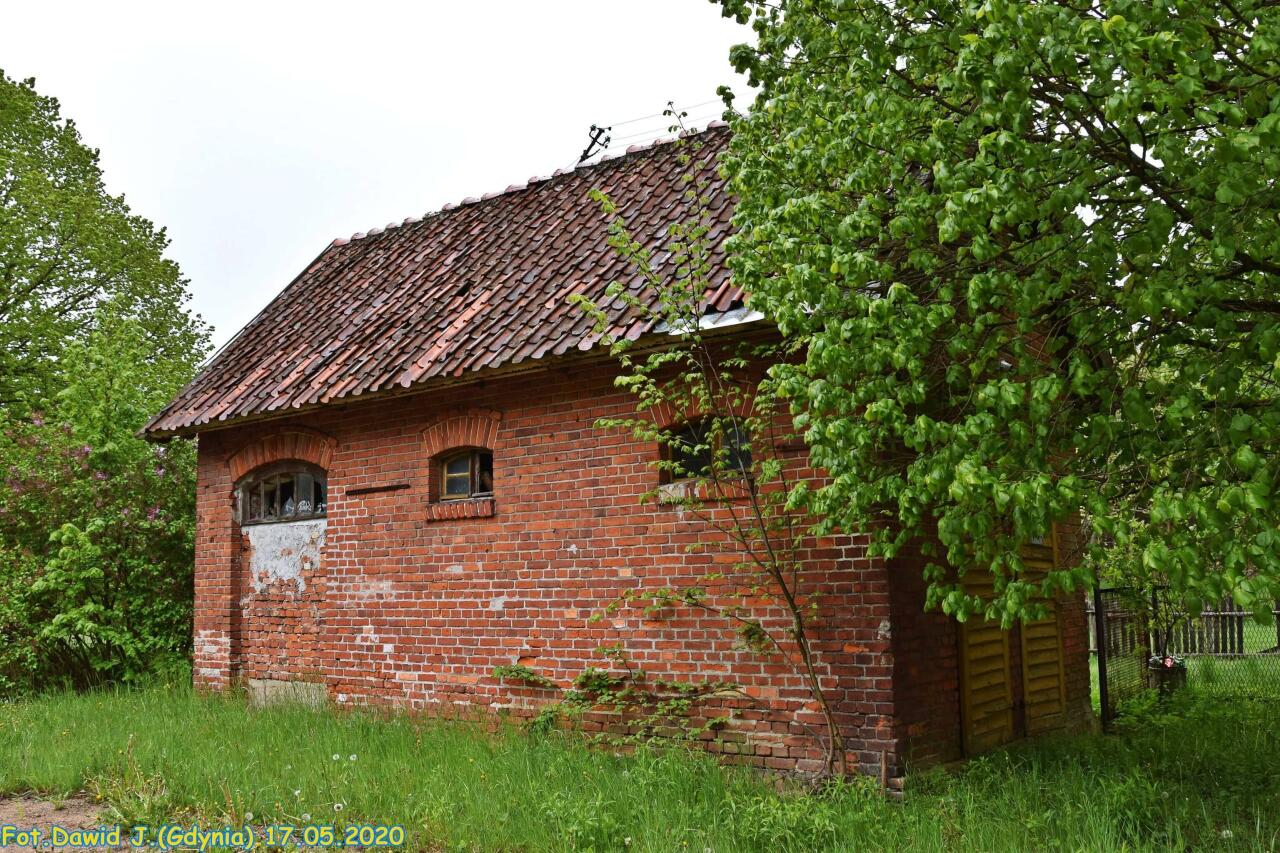 Budynek dworcowy z przyległym budynkiem magazynu widoczny od strony miejsca w którym kiedyś znajdowały się tory. Widok w kierunku Szczytna.